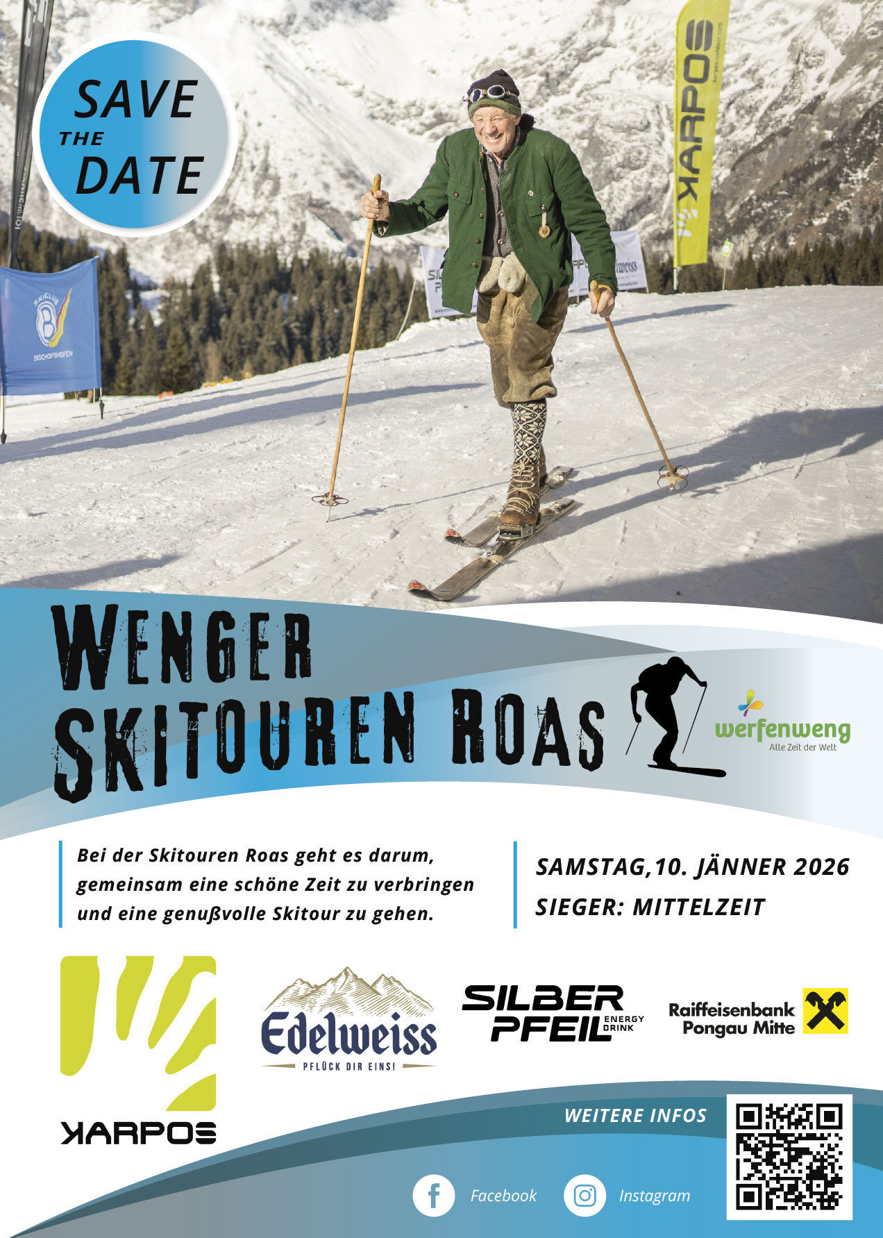 Die Wenger Skitouren Roas startet ein zweites in der kommenden Saison. Eine gemeinsame Skitour auf einer einfachen Strecke – von der Talstation IKARUS über 606 hm zur Skihütte minimal:isst (direkt beim Anton Proksch-Haus)- kein Rennen im klasischen Sinn, sondern nur die Mittelzeit wird gewerdet(Sieger = Mitteilzeit). Im Ziel gibt’s dann die Afterrace-Pary mit Musik und guter Stimmung.